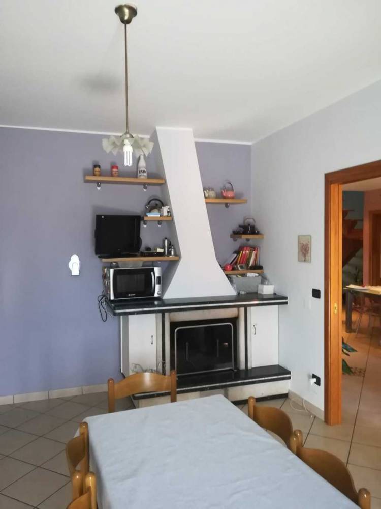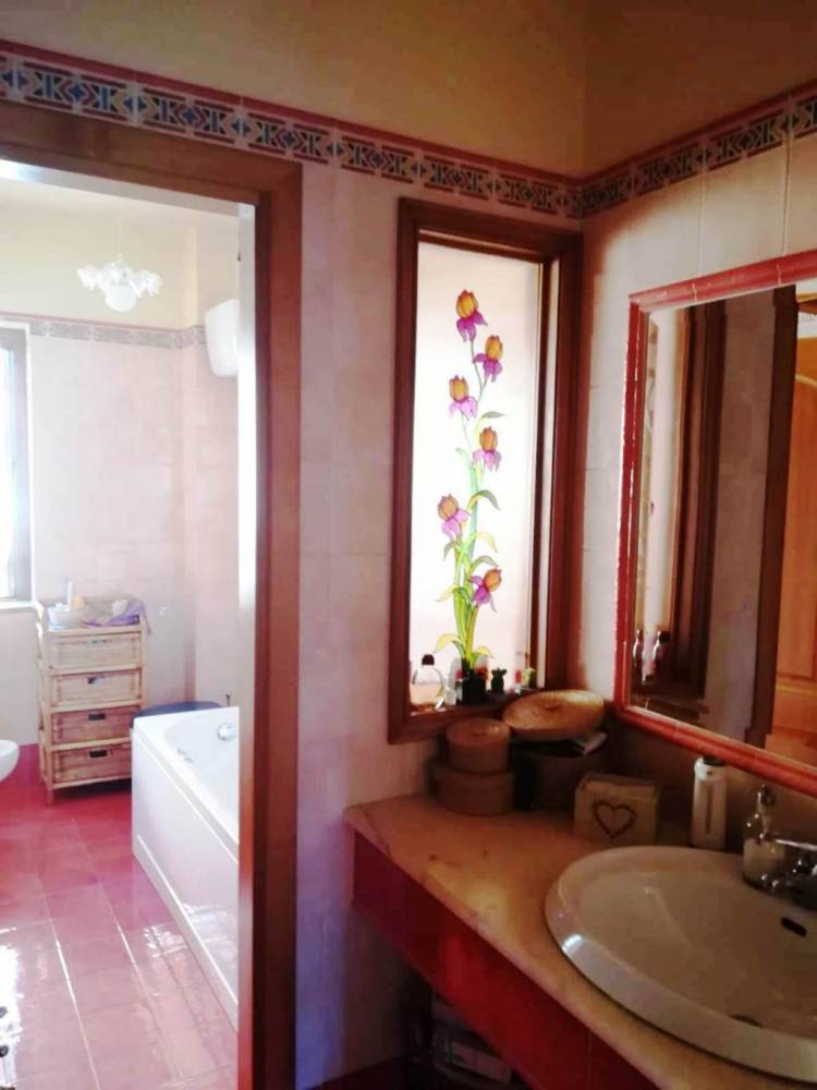 Il piano primo è composto da un vasto salone con un'elegante controsoffittatura con faretti, una cucina abitabile con camino, tre camere, doppi servizi e un comodo ripostiglio.