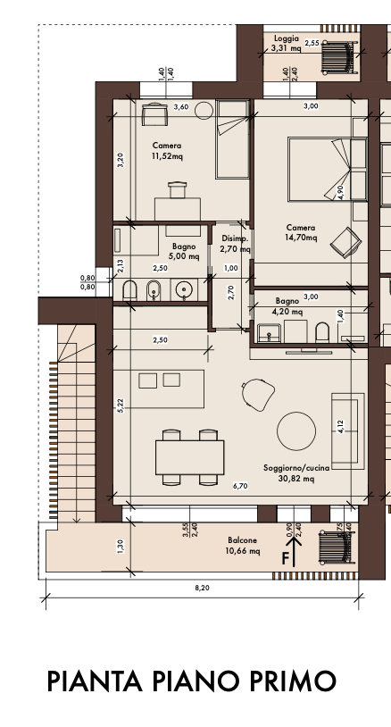 All'interno ti accoglie una zona living di oltre 30 mq con cucina a vista, ampia e luminosa grazie alla grande vetrata scorrevole che mette in continuità gli spazi interni con l'esterno. La disposizione prosegue con un disimpegno, due bagni moderni e due camere da letto, di cui la matrimoniale con accesso diretto a una loggia.