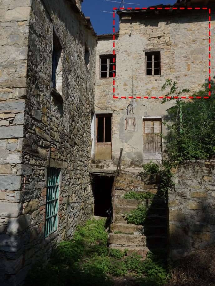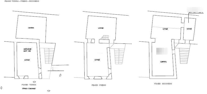 - Immobile B - fabbricato di civile abitazione da cielo a terra costituito da: un piano terreno composto due cantine; un piano primo comprendente una camera da letto ed una a cucina; da un piano secondo comprendente altra camera da letto ed una soffitta (con passaggio al fabbricato A).