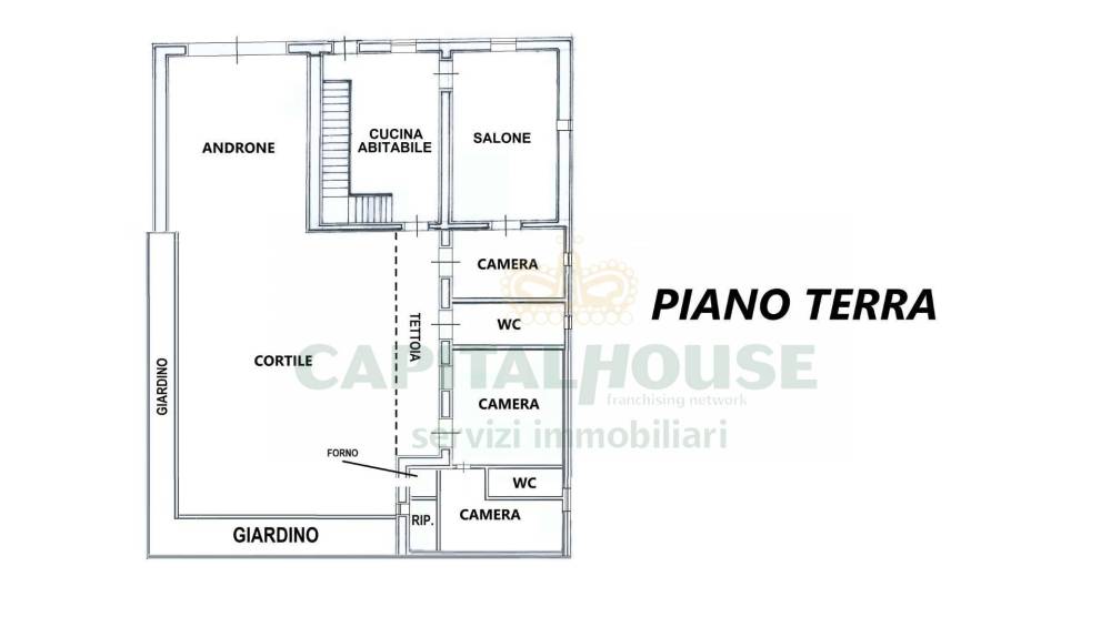 -piano terra: (120mq) cucina abitabile, salone, 2 bagni, ripostiglio, forno, cortile di 145mq e giardino di 25mq;