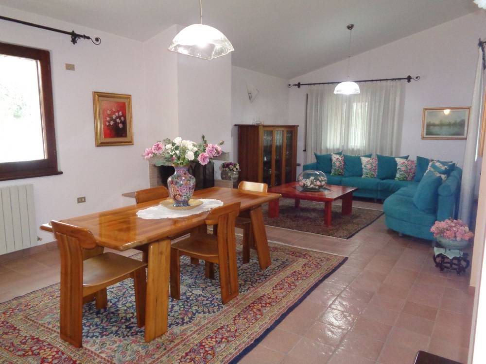 Da qui si accede ad un ampio salone dotato di un camino che aggiunge calore e charme, con attigua sala da pranzo e, adeguata negli spazi, una cucina abitabile che si affaccia per mezzo di una porta finestra, ad un'ampia veranda su lato ovet del giardino.