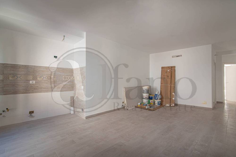 Al primo piano troviamo invece un appartamento rifinito, composto da ingresso, ampio salone con cucina a vista, due camere, servizio, ripostiglio e terrazzo a livello di 20 mq con portico in legno;
