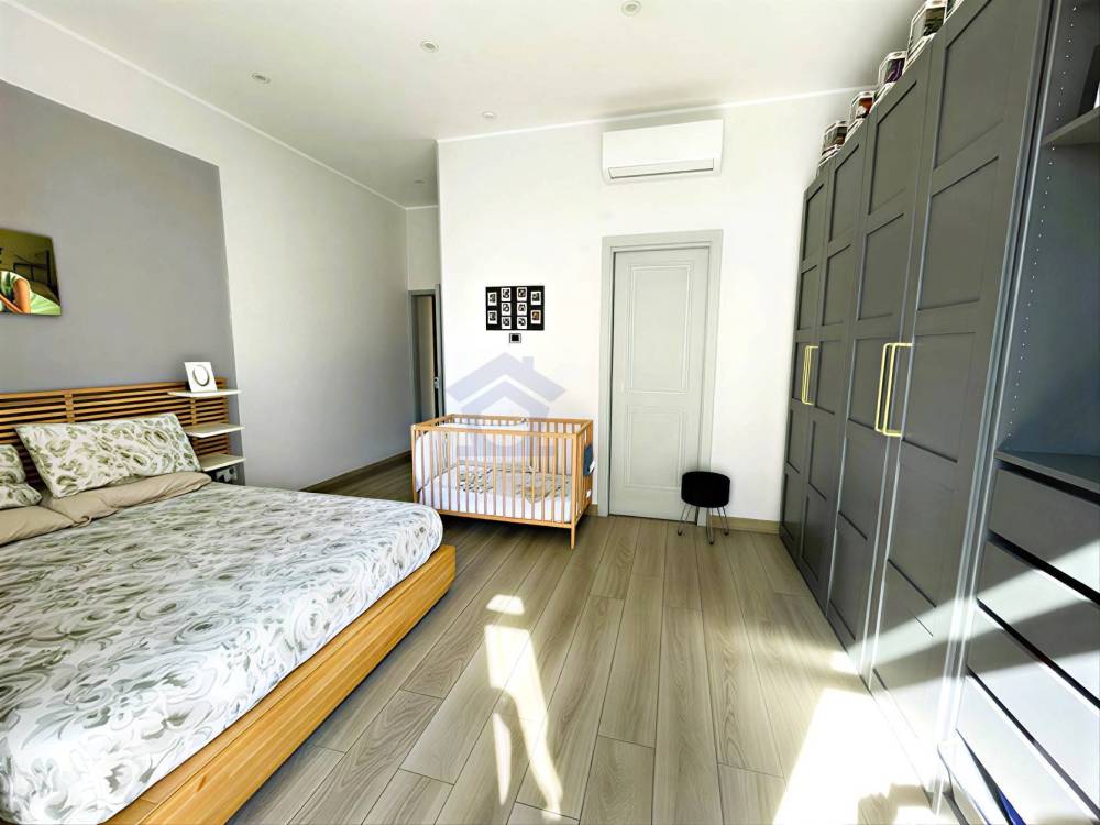 La zona notte offre due camere da letto ben organizzate, tra cui una camera matrimoniale con bagno privato, un dettaglio che aggiunge comfort e praticità alla vita quotidiana. Il secondo bagno, anchesso moderno e rifinito con materiali attuali, completa la funzionalità della zona notte.