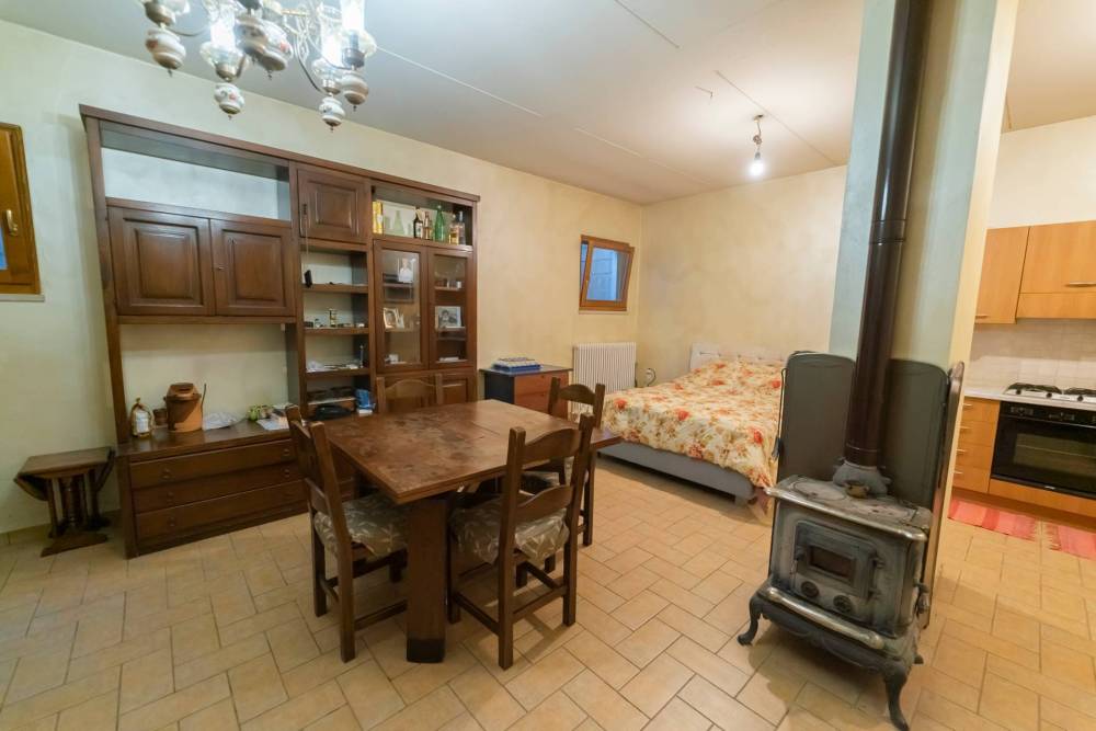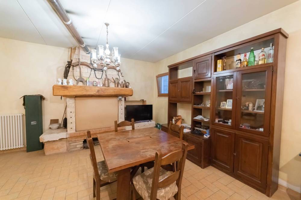 Lo spazioso soggiorno di oltre 32 MQ è molto luminoso grazie alla doppia finestra ed è servito da un camino a legna funzionante.