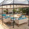 I restanti edifici raggiungono un totale di 800mq suddivisi tra sei appartamenti di taglio e dimensione diversa riservati agli ospiti e ai familiari, uffici, locali tecnici, una grande cucina industriale, una zona dedicata allarea lounge, una luminosa sala dedicata alle colazioni e alla sala da pranzo, e un elegante patio interno impreziosito dalla presenza di un angolo per il forno.