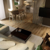 All'ingresso, un ampio e luminoso locale ospita la zona giorno, dotata di aperture prospicienti il giardino circostante, nel quale albergano due ulivi secolari e dal quale la vista si perde fino al mare.