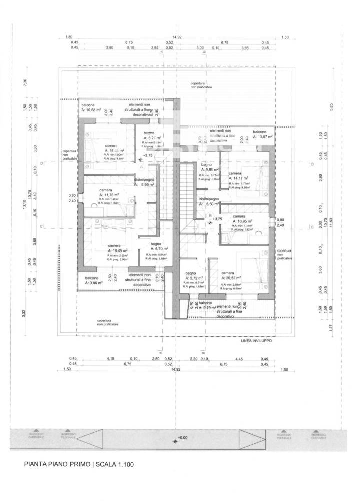 Al piano superiore si sviluppa la zona notte con la camera padronale di 20mq con all'interno il bagno e la cabina armadio, la seconda camera sempre matrimoniale e una doppia, e il servizio principale.