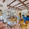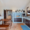 Il grande camino centrale a parete è tutto in travertino scolpito a mano, la cucina in muratura è completamente rivestita con ceramiche originali dipinte a mano.