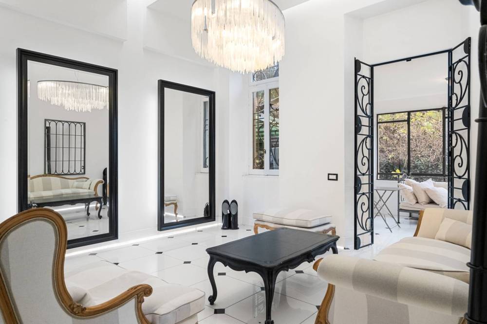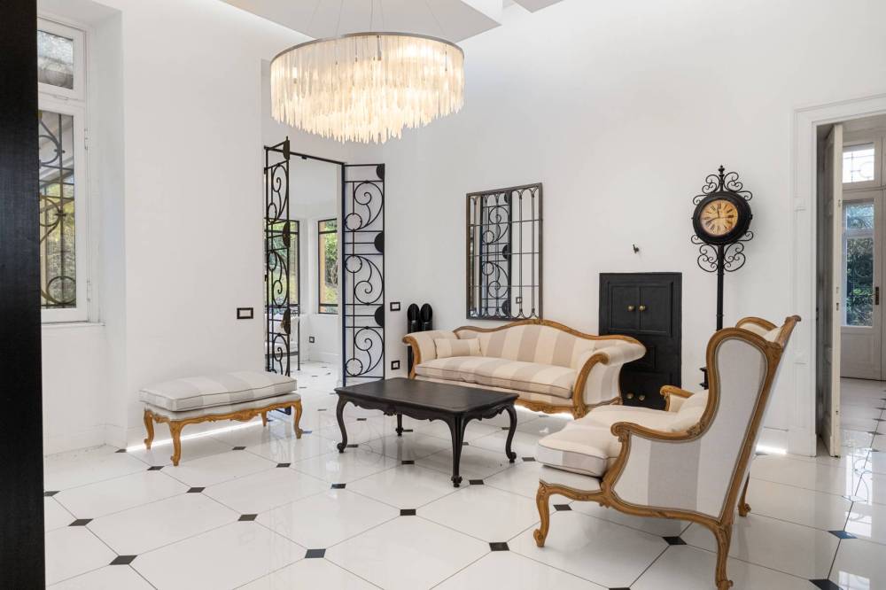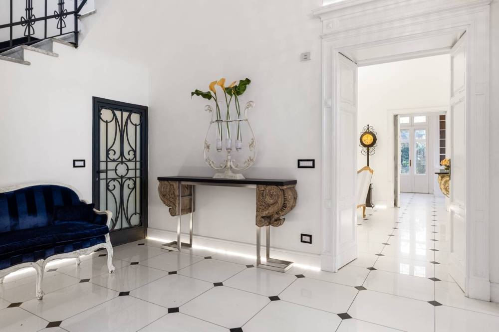 La ristrutturazione del 2014 ha esaltato i dettagli storici della villa, preservando al meglio gli elementi di pregio. Tra questi, gli alti soffitti decorati con raffinati stucchi, la scalinata in marmo, i pavimenti in mosaico e legno e gli infissi originali, restaurati con cura per conservarne lautenticità.