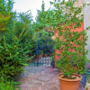 giardino con piante, alberi e rocce, pavimentato e con tettoia con travi di legno e magazzino attrezzi;