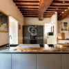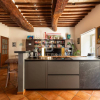 Al primo piano, anchesso dotato di ingresso indipendente, si trova la zona giorno, studiata per diventare la zona conviviale e dotata di una cucina di design moderno Stosa, con ampia isola equipaggiata con finiture e dotazioni allavanguardia, che permette di cucinare e nello stesso tempo di relazionarsi con la famiglia. I soffitti alti 3,50 metri sono caratterizzati da due imponenti travi in noce antico, che conferiscono unulteriore eleganza a questo spazio aperto e luminoso. La luce oltre provenire dalle ampie finestre ad anta unica viene garantita da binari con led.