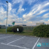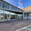 L accesso alla zona commerciale avviene attraverso un fronte vetrato che affaccia su un ampio piazzale ad uso parcheggio.