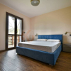 Il primo piano è accessibile da scala esterna ed ospita un appartamento con cucina a vista e camino, stufa a pellet, balcone privato, due camere matrimoniali (una con bagno privato) e un secondo bagno completo.