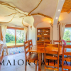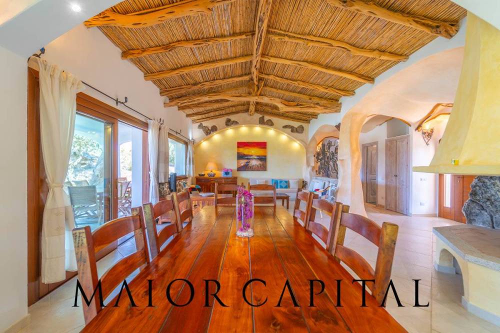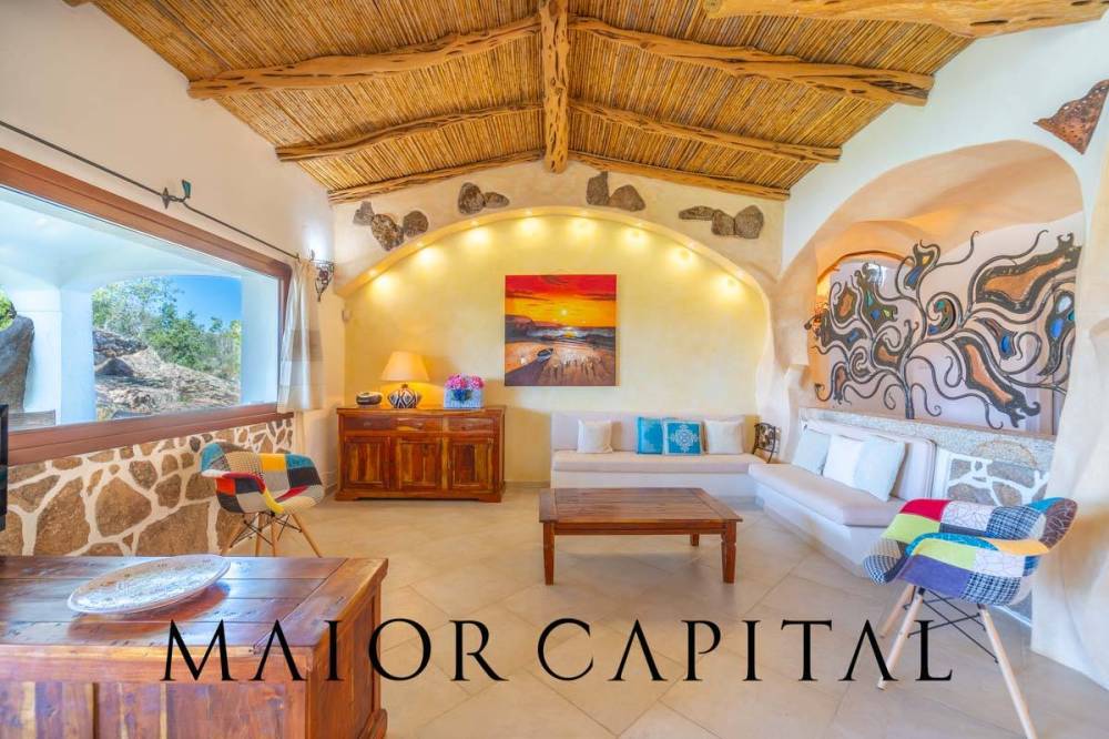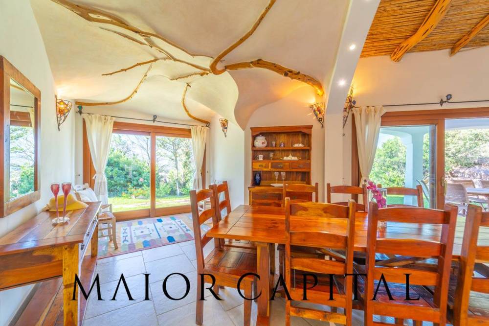 Un elegante viale conduce alla villa, che si distingue per lo stile architettonico sardo, con soffitti in ginepro, rifiniture in ferro battuto, pavimenti in cotto e mobili artigianali realizzati su misura. La zona giorno, ampia e luminosa, si affaccia sul giardino e offre una splendida vista sul verde circostante.