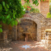 Nella corte dell'abitazione si presentano due gazebi, una zona barbecue e numerose rifiniture in pietra arenaria, e mascheroni di pietra scolpita.