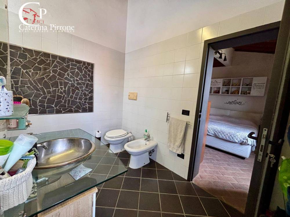 L'ingresso principale è ubicato nell'antica piazza con entrata da loggia di proprietà direttamente nel soggiorno con cucina open space, camera matrimoniale, stanza da bagno, accesso anche a terrazza abitabile con scala esterna che porta al giardino. Attraverso una scala interna si accede alla zona seminterrata dove troviamo 2 vani con altro servizio. Questa parte della casa ha anche altro accesso dal giardino di proprietà esclusiva dove vi è un piccolo ripostiglio condonato.