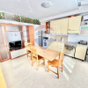 Zona living con grandi vetrate antisfondamento dotate di zanzariere, divano letto e cucina completamente arredata.
