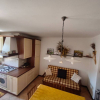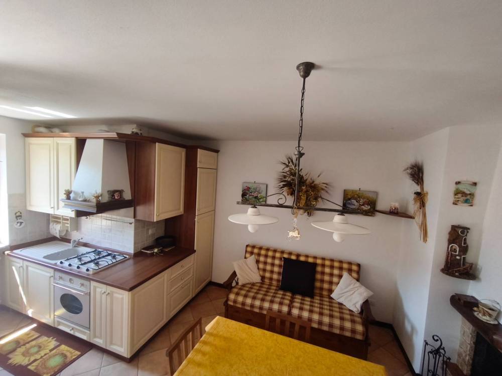ingresso su luminoso soggiorno con angolo cottura ben organizzato e angolo camino;