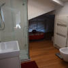 Primo piano: la zona notte è raggiungibile tramite l'ascensore o la scala in pietra. A sinistra si trova un ampio guardaroba con bagno annesso e una luminosa camera da letto con letto matrimoniale e accesso alla fantastica terrazza di 40 m² con vista sul mare. Da qui la vista spazia su tutta la costa, dal porto di Giulianova a Tortoreto Lido. Gli altri ambienti di questo piano comprendono un piccolo soggiorno, un'altra camera con letto matrimoniale, un bagno e un balcone con vista sul mare.