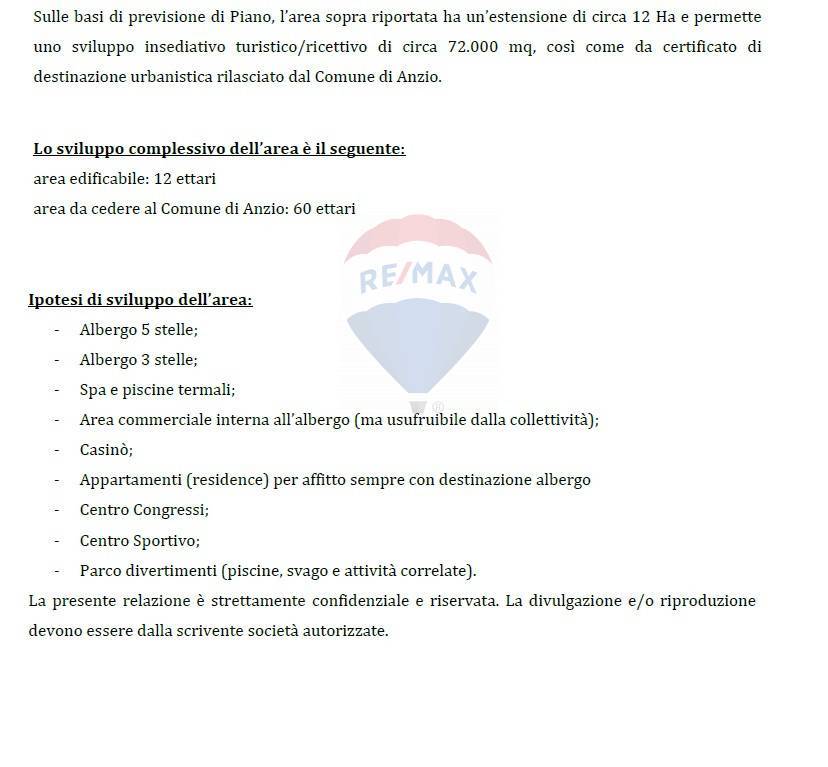 Il terreno si trova nel Comune di Anzio, un'area balneare molto frequentata durante la stagione estiva, che potrebbe attrarre investitori interessati a realizzare strutture ricettive come hotel, resort, o strutture per il turismo. La vicinanza alla Riserva Naturale Regionale Tor Caldara, un'area di interesse naturale, potrebbe anche essere un punto di forza per chi desidera sviluppare attività eco-turistiche.
