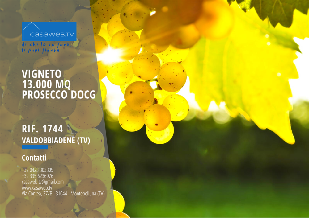In Comune di Valdobbiadene (TV), in zona pianeggiante e soleggiata, proponiamo la vendita di un vigneto a Prosecco DOCG che presenta una superficie di 13.000 mq ed è in piena produzione. Zona DOCG Valdobbiadene Conegliano in perfette condizioni di manutenzione e facilmente raggiungibile. MAGGIORI INFORMAZIONI SU RICHIESTA SCRITTA. L'indirizzo del terreno è approssimativo per motivi legati alla tutela della privacy. - Manda un SMS al 3356236976 con il testo (info 1744) aggiungi il tuo Nome ed il Tuo indirizzo Email, saremo noi a contattarti per darti maggiori dettagli ed inviarti una Email con materiale informativo. In alternativa chiama Tel. 0423303305 - Cell. 3356236976 - Per altre proposte immobiliari, visita il nostro sito ... - Ti interessa questa Proprietà? Contattaci per prenotare una visita.