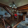 Giunti all'esterno della proprietà, entriamo da scalinata in sasso, a risosso del del giardino. Superato il terrazzo di circa dieci di metri quadri, prospicente l' entrata al piano terra, ci accoglie un confortevole ambiente abitativo quasi totalmente in legno, sia nella struttura sia nei mobili e negli armadi, in buona parte a muro. Troviamo da subito una sala da pranzo,una cucina abitabile con vano lavabo e bagno con doccia a fianco; abbiamo poi un' ampia zona rustica formata da altra sala da pranzo e suggestiva sala soggiorno col camino d'atmosfera.