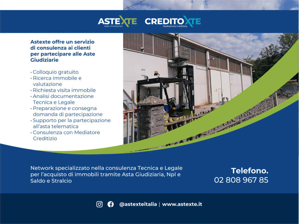 Beni A (nelle precedenti vendite individuati al Lotto 1) La piena proprietà di un complesso immobiliare costituito di un capannone ad uso laboratorio-officina, con area cortilizia pertinenziale. il lotto è costituito da una componente mobiliare formato da: un carroponte monotrave (valore stimato EURO 7.000,00), un carroponte bitrave (valore stimato EURO 9.000,00) ed impianto di verniciatura cabinato (valore stimato EURO 550,00). Prezzo base EURO 168.000 di cui EURO 16.550 per la componente mobiliare. Beni B (nelle precedenti vendite individuati al Lotto 2) Piena proprietà due fabbricati ad uso magazzino, appezzamento di terreno di forma irregolare di mq. 300.