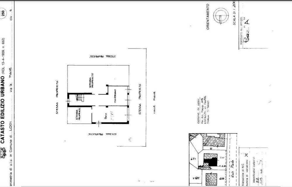 piena proprietà per la quota d 1000/1000 di appartamento sito in Lodi V.le Piave n. 4 composto da soggiorno/sala da pranzo, due camere, cucina, servizi e due balconi al piano secondo, cantina con WC a piano terra e una cantina al piano interrato, accessibili da scala comune interna al fabbricato.