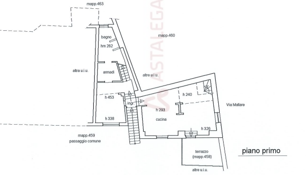 - piano primo (abitativo), avente altezza interna variabile (v. grafici illustrativi), è composto da ingresso, soggiorno, cucina, camera, disimpegno, cabina armadio e bagno nonché terrazzo; dal piano è possibile accedere a due distinti soppalchi accessibili uno dal disimpegno adiacente al vano camera e l'altro, con scala a chiocciola, dal vano soggiorno.