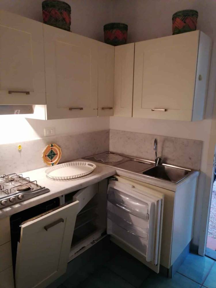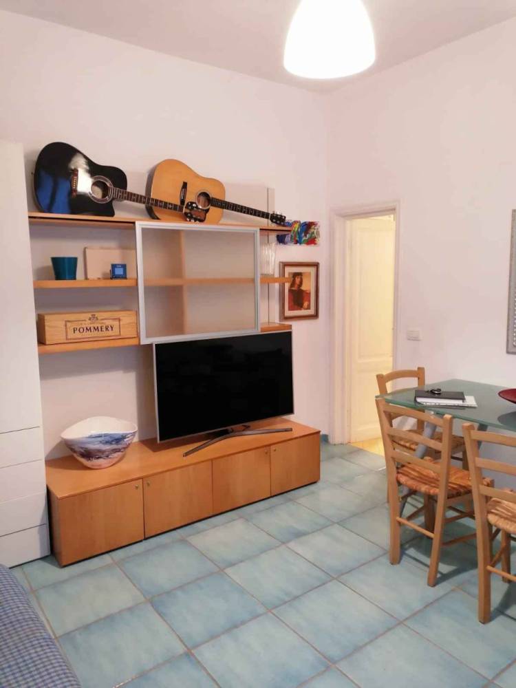 Ingresso living con divano letto e Tv, cucina completa di lavastoviglie, camera matrimoniale e bagno con doccia.