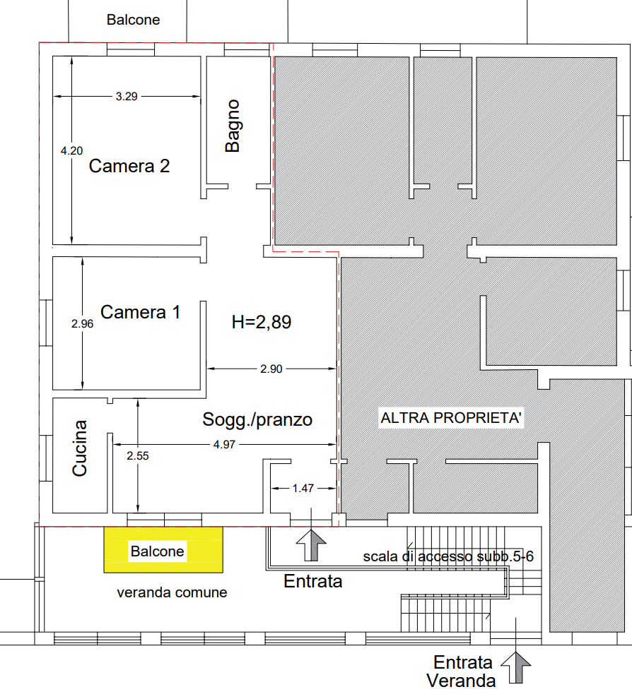 Trattasi di appartamento posto al piano secondo di edificio residenziale, con accesso diretto dalla veranda comune, articolato in ingresso, soggiorno/pranzo, cucinotto, bagno, due camere e balconcino.