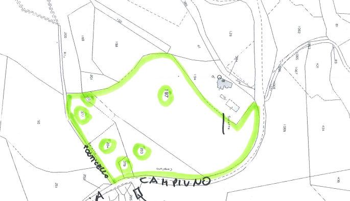 Trattasi di terreno agricolo situato in Via Campiuno a Borgo Tossignano (BO), con una superficie complessiva di circa 16.858 mq, suddivisi in: frutteto di 11.021 mq, seminativo di 27 mq, frutteto di 293 mq, frutteto di 2.550 mq, frutteto di 1.377 mq, seminativo di 181 mq, frutteto di 1.198 mq e frutteto di 204 mq.