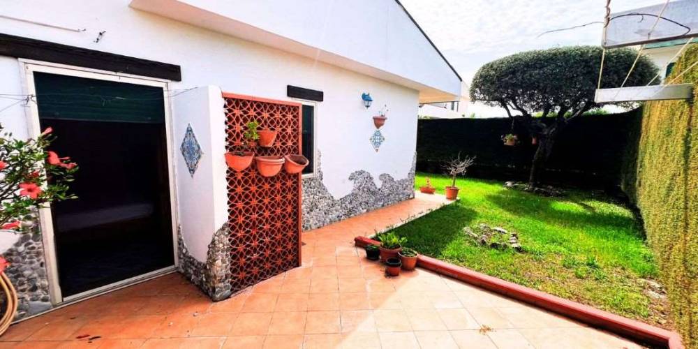 La villetta è dotata di un giardino semi pavimentato, ampio e comodo, perfetto per trascorrere momenti all'aperto in totale relax. Lo spazio esterno è ben tenuto e valorizza ulteriormente la proprietà.