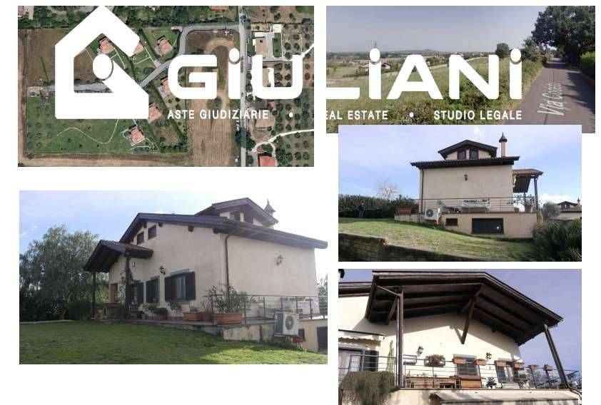 Riano Via Colle del Drago n. 102 A. Villino su tre livelli collegati da scala interna composto da: PT soggiorno con camino e cucina con accesso ai porticati, disimpegno, bagno, due stanze; P1 camera, bagno, locali accessori; PS ampio salone con angolo cottura, ripostiglio, due camere e due bagni. Completa la proprietà una autorimessa e giardino di mq 893.