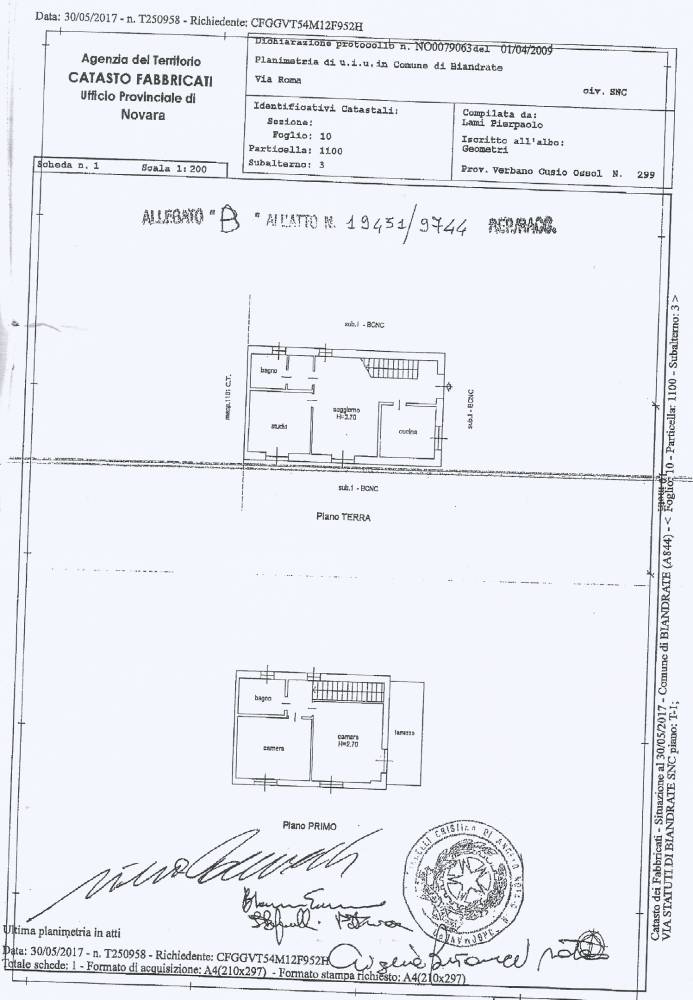 Scala interna che porta al piano superiore, due camere da letto, un bagno finestrato con vasca, terrazzo. Infissi in legno doppio vetro.  La proprietà include un box, un doppio giardino e un grande cortile, cancello elettrico. Orientamento sud, distanza da Novara 10 km.