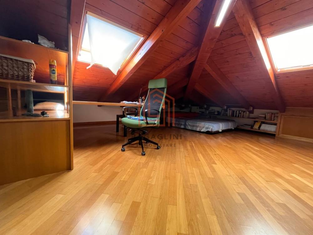 La zona notte offre tre camere da letto versatili: una con collegamento diretto alla mansarda, una spaziosa matrimoniale con balcone privato e una terza stanza multifunzionale. Un bagno finestrato con vasca e balcone indipendente assicura ulteriore comodità.