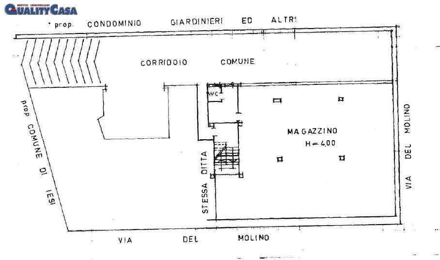 Agenzia immobiliare QualityCasa propone in vendita MAGAZZINO / GARAGE  zona piscina a Jesi di 215 m²: Ingresso, vano unico, ripostiglio, bagno, porta carraia e 2 finetre alte, altezza 4 metri e uso della corte condominiale. Discrete condizioni. Possibile suddividerlo in 3 garage.