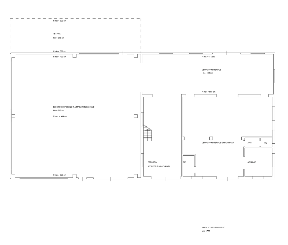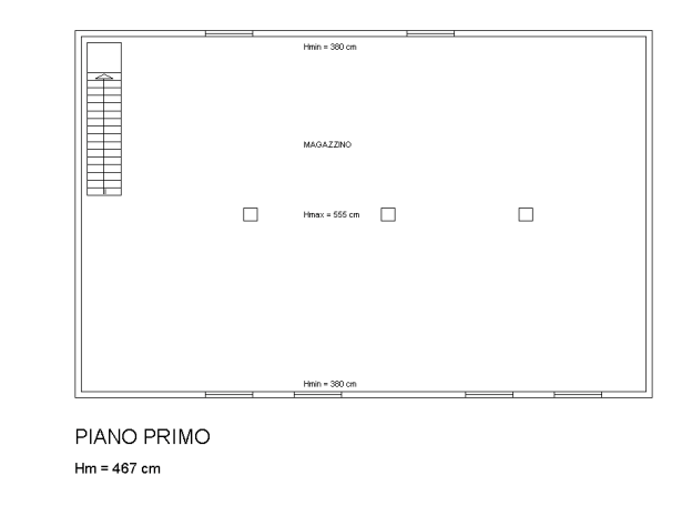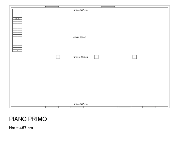 Trattasi di un capannone ad uso deposito di 356mq composto da piano terra ha quattro vani ad uso deposito di 340mq, uno ad uso ripostiglio, servizio igienico con anti-wc e archivio. Al piano primo troviamo un magazzino di 240mq.
