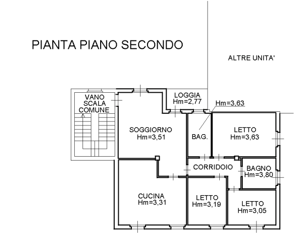 Trattasi di appartamento posto al piano secondo composto da ingresso-soggiorno, cucina, loggia, corridoio, tre camere da letto e due bagni.