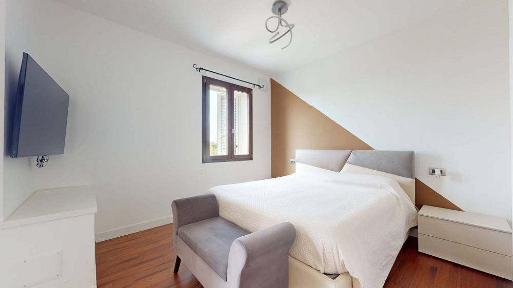 La zona notte, situata al piano superiore, è oggi composta da due ampie camere matrimoniali di generose dimensioni. Originariamente tre, le stanze sono state ripensate e ridistribuite: due camere sono state fuse per creare ununica, straordinaria matrimoniale doppia, che regala spazi ariosi e un comfort superiore. A completare il piano, un secondo bagno con doccia arricchito da finiture di pregio.