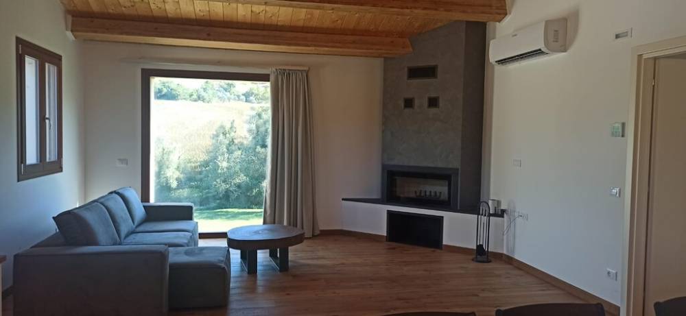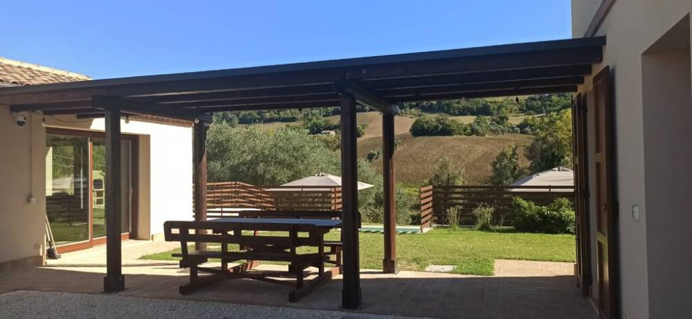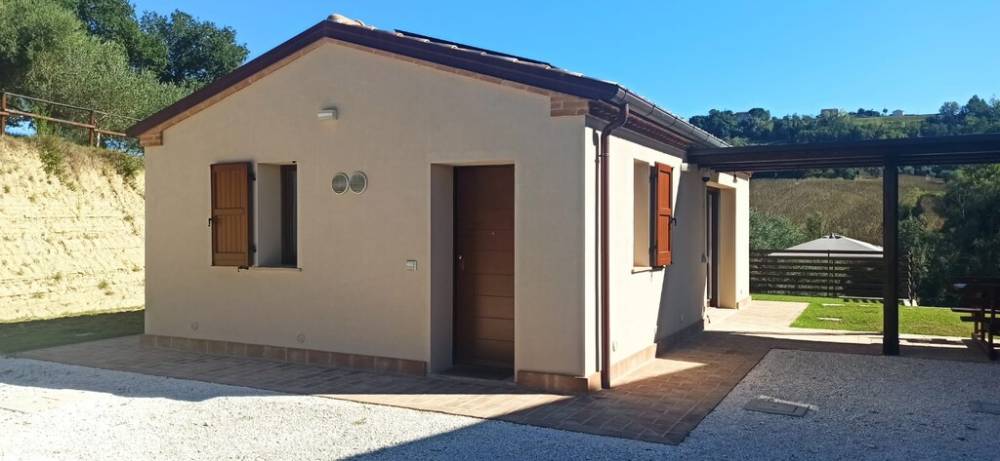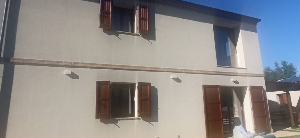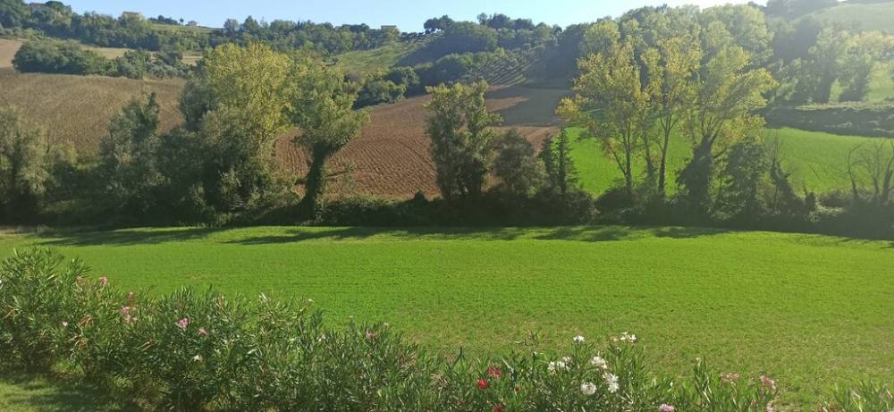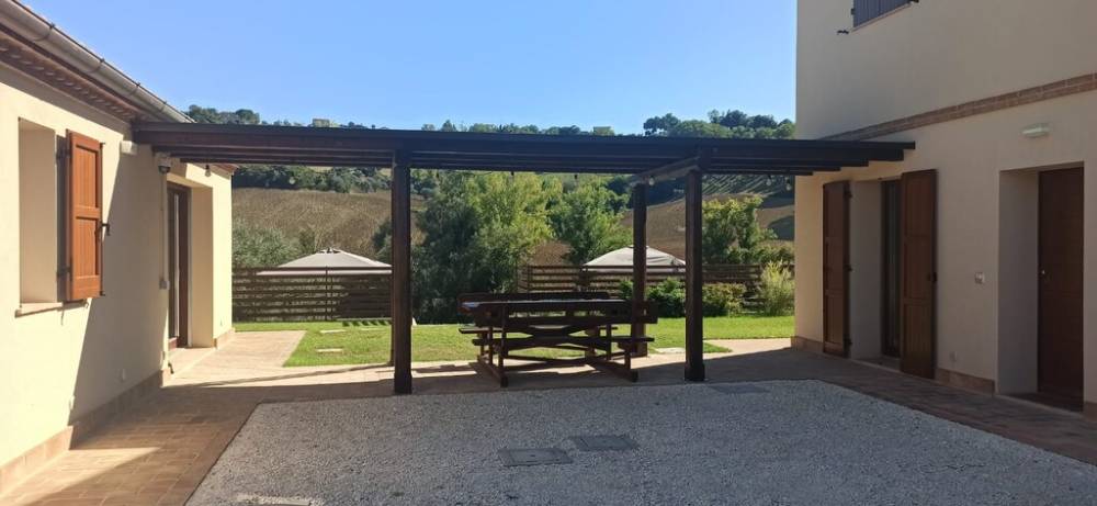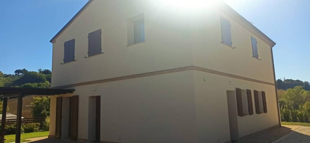 Immerso nel verde delle colline marchiagiane, splendido casale completamente ristrutturato con mq. 20.000 di terreno piu' uliveto e corte di mq. 2.000 con piscina a sfioro. Il casale e' suddiviso in tre appartamenti piu' depandance indipendente. P.T. 2 bilocali con ingresso indipendente e bagno in camera, P.1: Appartamento con soggiorno/angolo cottura, matrimoniale, cameretta, lavanderia, bagno