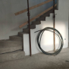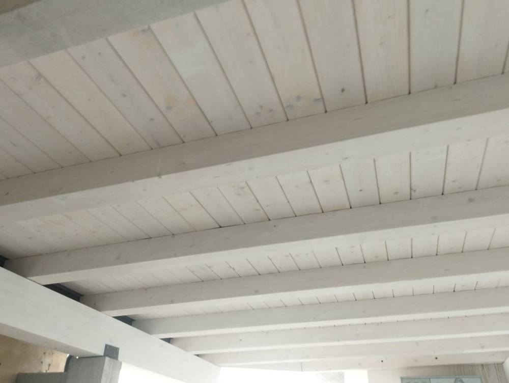 Una scenografica scala a vista dal salone porta alla mansarda, caratterizzata da travi in legno sbiancato.