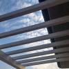 L'ingresso principale si apre su un ampio giardino su quattro lati e un porticato con travi in legno sbiancato che può ospitare due auto. L'interno si sviluppa su due livelli: