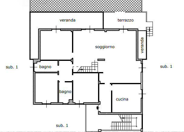 Al piano terreno-rialzato da ingresso, cucina, ampio soggiorno, due bagni, una sala di più ridotte dimensioni ed ulteriori due vani, disimpegno, ampio terrazzo.