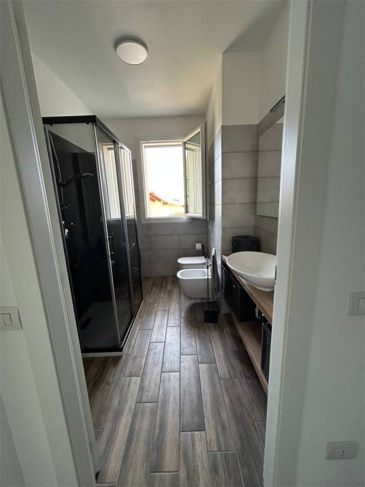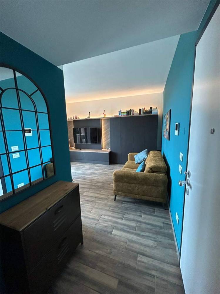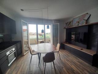 Composto da una luminosa e spaziosa e luminosa zona living/soggiorno con cucina a vista che si affaccia sul terrazzino. Diviso da un disimpegno abbiamo la camera matrimoniale e un bagno finestrato completo di tutti i sanitari sospesi e box doccia.