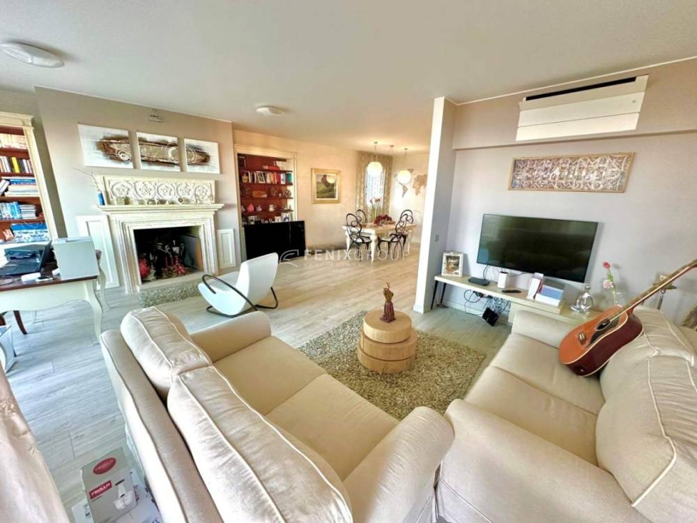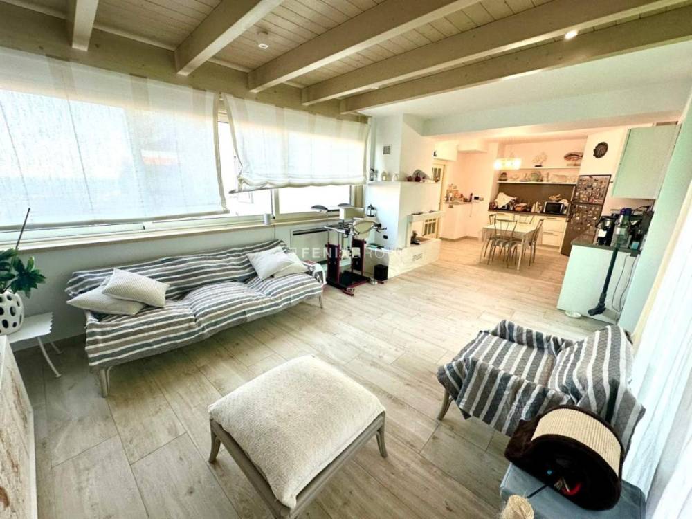 Le grandi vetrate scorrevoli si affacciano su un balcone panoramico che regala un’incredibile continuità tra interno ed esterno, inondando gli spazi di luce naturale e valorizzando ogni angolo della casa.