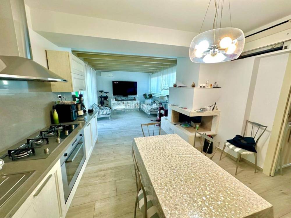 Il camino, elemento centrale della zona giorno, dona calore e atmosfera, mentre la cucina a vista, contemporanea e ben integrata è pensata per chi ama con
