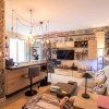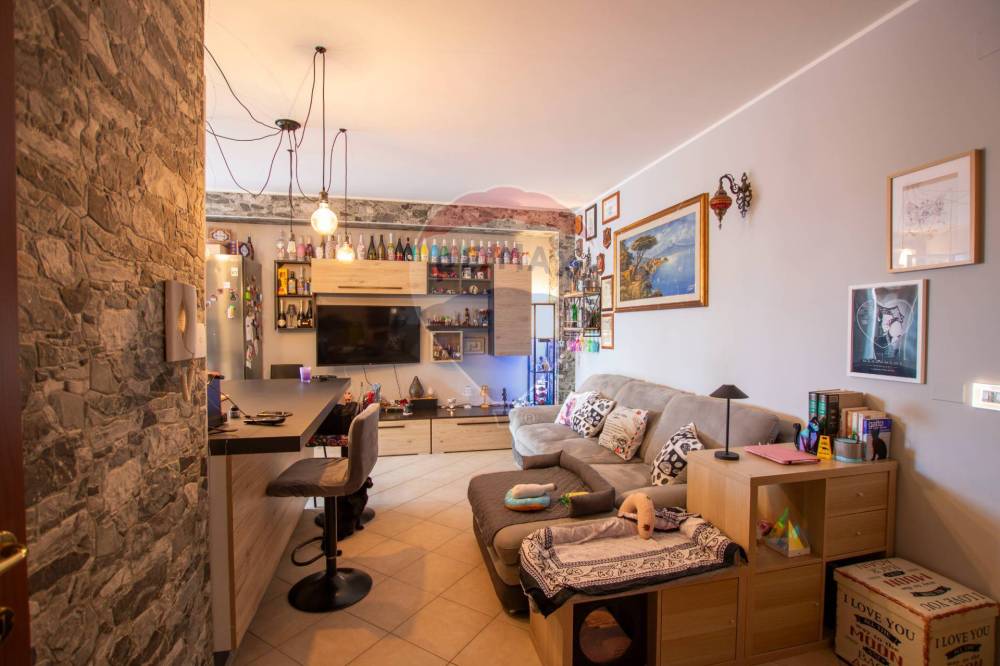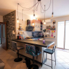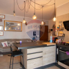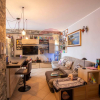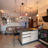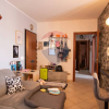 Ingresso su zona living con cucina a vista e richiami in pietra