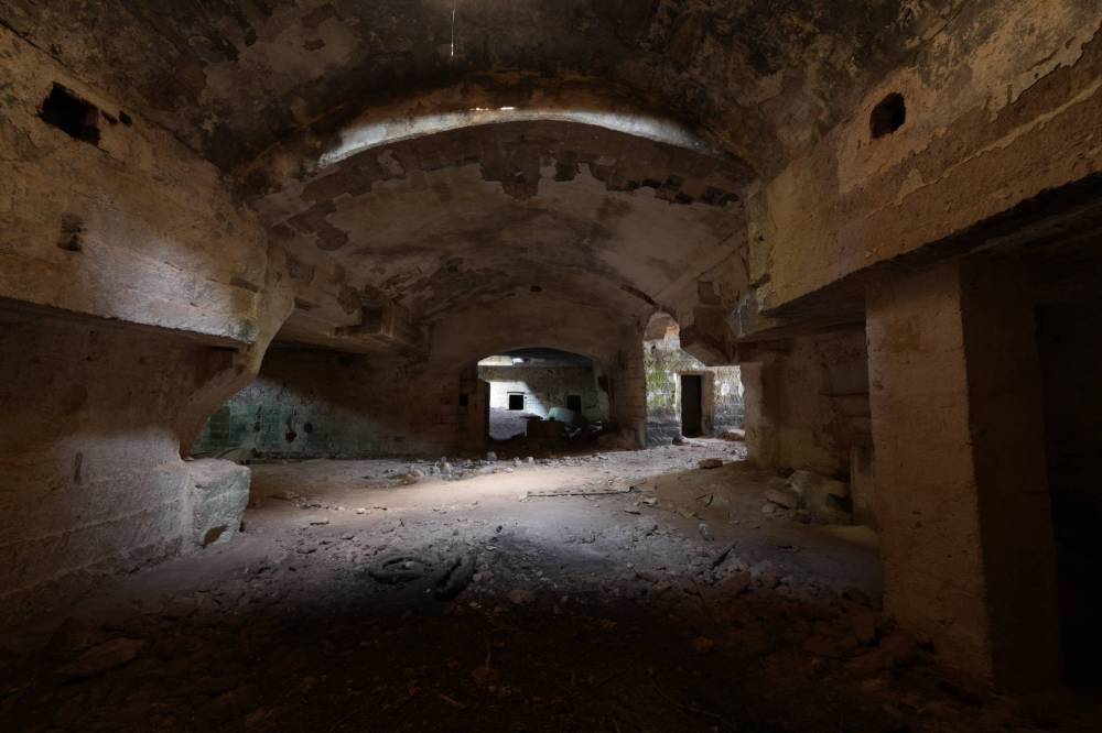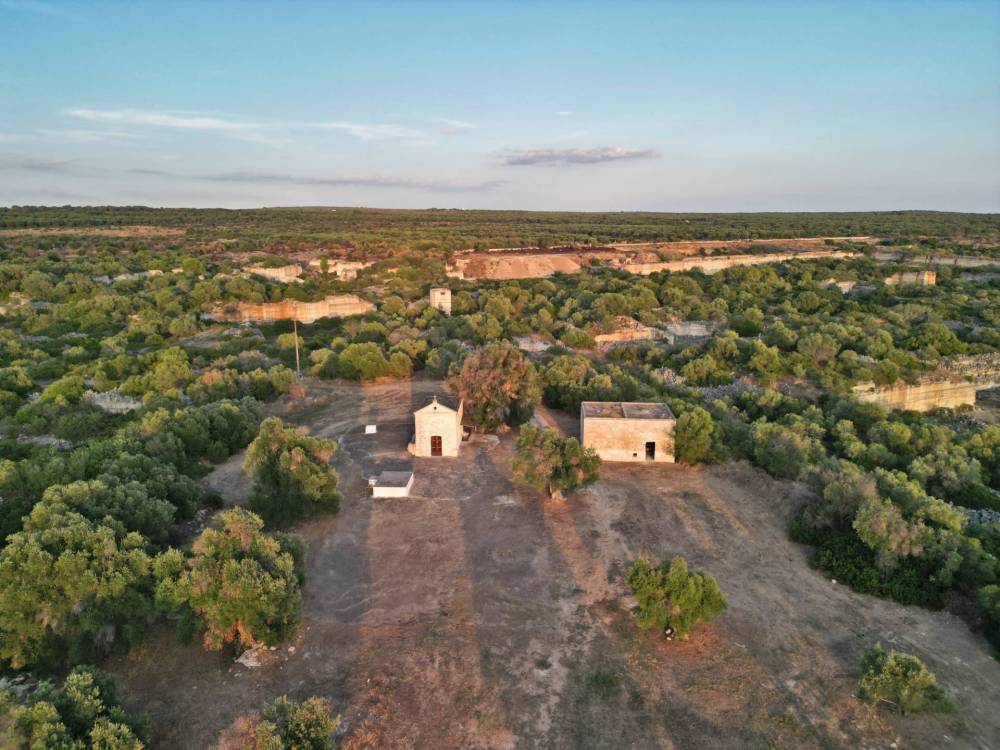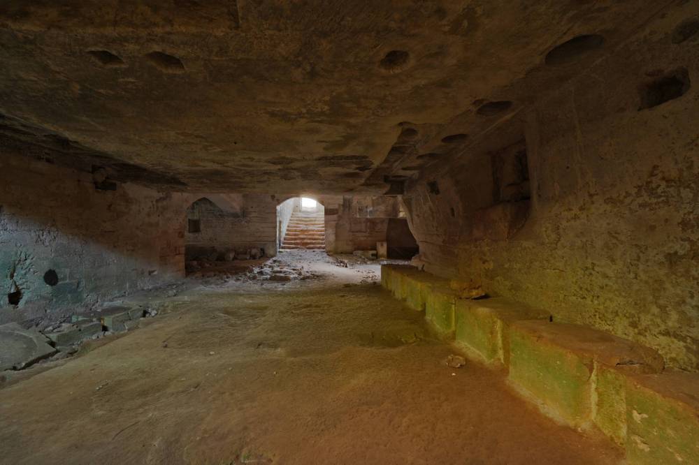 La cripta, scavata nella roccia, custodisce un altare con affreschi e testimonianze di culto che rendono questa masseria un luogo intriso di spiritualità e fascino.