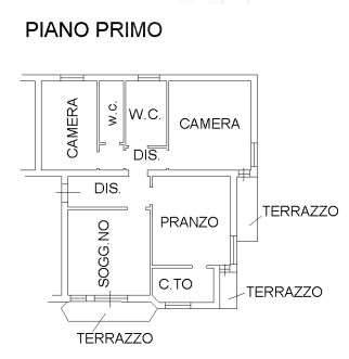 L'appartamento è ubicato al piano primo, composto da ingresso, soggiorno, pranzo/cucinotto, disimpegno con due camere da letto e due bagni.